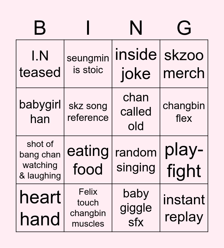 This bingo card has 16 words: Felix touch changbin muscles, play-fight, inside joke, I.N teased, shot of bang chan watching & laughing, seungmin is stoic, random singing, baby giggle sfx, babygirl han, skz song reference, heart hand, skzoo merch, eating food, changbin flex, chan called old and instant replay.