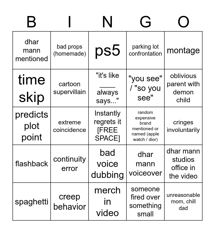 This bingo card has a free space and 27 words: dhar mann voiceover, dhar car, "you see" / "so you see", merch in video, time skip, ps5, bad props (homemade), flashback, random expensive brand mentioned or named (apple watch / dior), dhar mann studios office in the video, predicts plot point, parking lot confrontation, spaghetti, creep behavior, oblivious parent with demon child, kids with ipad, cartoon supervillain, "it's like ____ always says...", continuity error, dhar mann mentioned, cringes involuntarily, someone fired over something small, extreme coincidence, unreasonable mom, chill dad, bad voice dubbing, montage and problematic lesson.