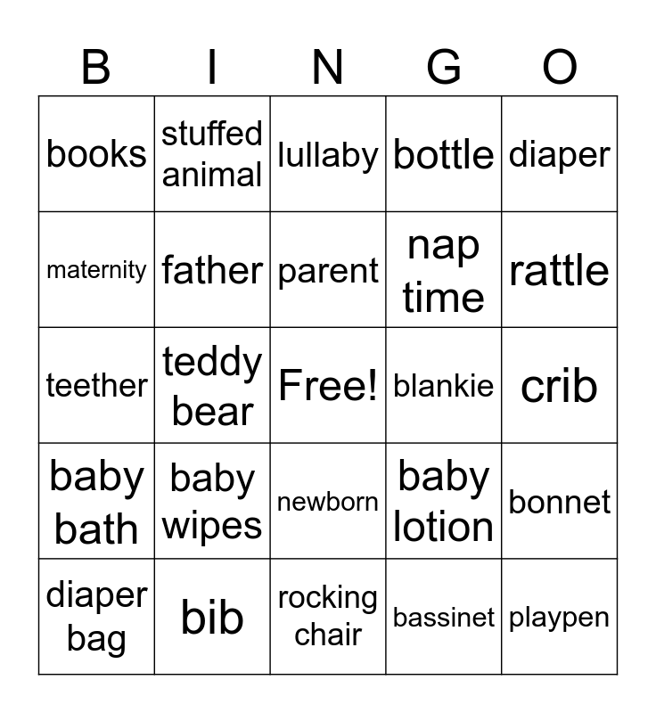 This bingo card has a free space and 35 words: baby, pacifier, mother, father, newborn, bottle, maternity, sippy cup, parent, baby monitor, teether, diaper, crying, learning blocks, books, blankie, bassinet, teddy bear, baby bath, playpen, baby lotion, diaper bag, bonnet, bib, lullaby, rattle, high chair, baby food, nap time, crib, baby powder, rocking chair, baby wipes, stuffed animal and toys.