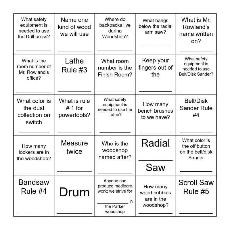 This bingo card has 30 words: Bandsaw Rule #4 ________, What safety equipment is needed to use the Radial Arm Saw? _____________, What room number is the Finish Room? ___________, Drum Sander Rule #9 __________, What is Mr. Rowland's name written on? __________, What safety equipment is needed to use the Drill press? _____________, Name one kind of wood we will use __________, Who is the woodshop named after? ___________, How many bench brushes to we have? __________, Scroll Saw Rule #5 ________, How many lockers are in the woodshop? ___________, Lathe Rule #3 ________, What is the woodshop's room number? ____________, How many wood cubbies are in the woodshop? ____________, What color is the off button on the belt/disk Sander ____________, Drill Press Rule #6, What is rule # 1 for powertools? __________, What safety equipment is needed to use the Lathe? _____________, Radial ______ Saw, What safety equipment is needed to use Belt/Disk Sander? _____________, What color is the dust collection on switch _________, Drum _____, Where do backpacks live during Woodshop? _____________, Keep your fingers out of the __________, Belt/Disk Sander Rule #4 __________, What is the room number of Mr. Rowland's office? _____________, Measure twice _________, Anyone can produce mediocre work; we strive for _____________ in the Parker woodshop, What hangs below the radial arm saw? ___________ and What color is the drum sander ___________.