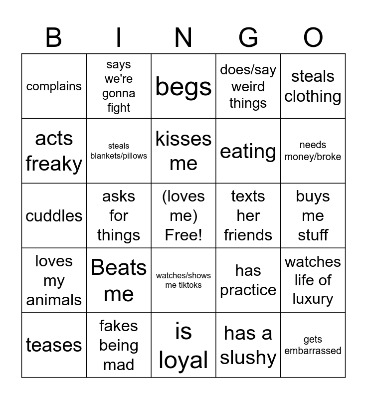 This bingo card has a free space and 24 words: Beats me, fakes being mad, kisses me, teases, steals clothing, complains, acts freaky, says we're gonna fight, texts her friends, watches/shows me tiktoks, eating, cuddles, has practice, watches life of luxury, steals blankets/pillows, has a slushy, buys me stuff, begs, needs money/broke, asks for things, gets embarrassed, loves my animals, does/say weird things and is loyal.