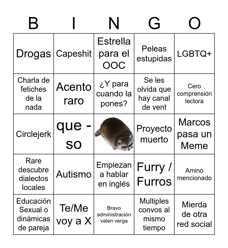 This bingo card has a free space and 24 words: Autismo, Te/Me voy a X, ¿Y para cuando la pones?, Educación Sexual o dinámicas de pareja, LGBTQ+, Drogas, Charla de fetiches de la nada, Capeshit, Proyecto muerto, Empiezan a hablar en inglés, Se les olvida que hay canal de vent, Circlejerk, Furry / Furros, Amino mencionado, Acento raro, Multiples convos al mismo tiempo, Marcos pasa un Meme, Estrella para el OOC, Cero comprensión lectora, que - so, Mierda de otra red social, Rare descubre dialectos locales, Peleas estupidas and Bravo administración valen verga.