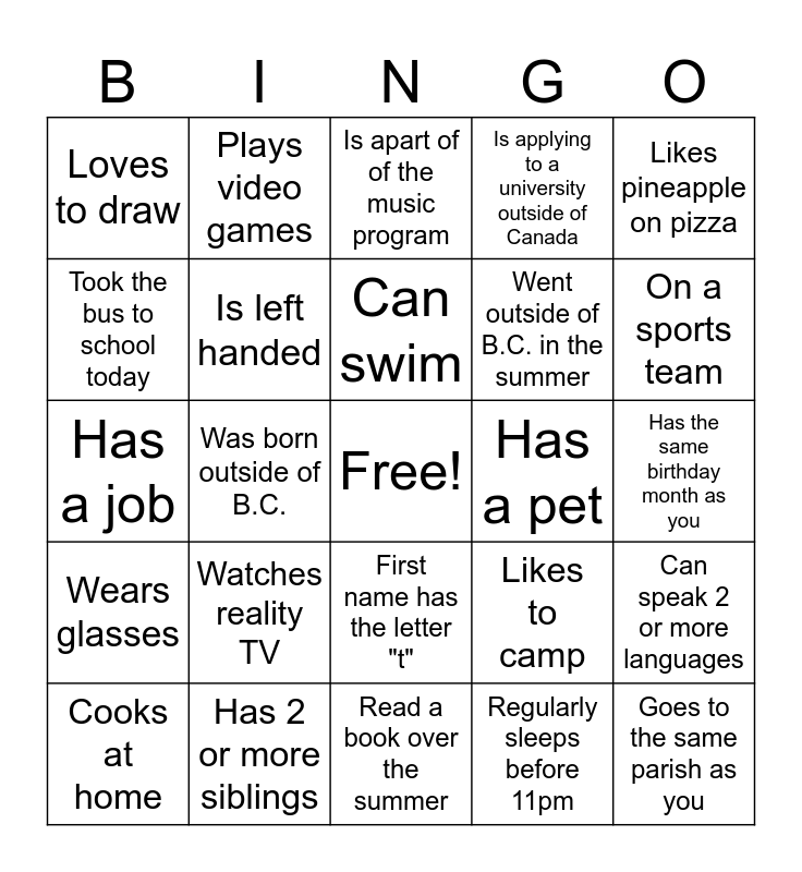 This bingo card has a free space and 24 words: Watches reality TV, Has 2 or more siblings, Can swim, Cooks at home, Likes pineapple on pizza, Loves to draw, Took the bus to school today, Plays video games, Has a pet, First name has the letter "t", Went outside of B.C. in the summer, Has a job, Likes to camp, Can speak 2 or more languages, Is left handed, Regularly sleeps before 11pm, Has the same birthday month as you, Is apart of of the music program, On a sports team, Was born outside of B.C., Goes to the same parish as you, Wears glasses, Is applying to a university outside of Canada and Read a book over the summer.