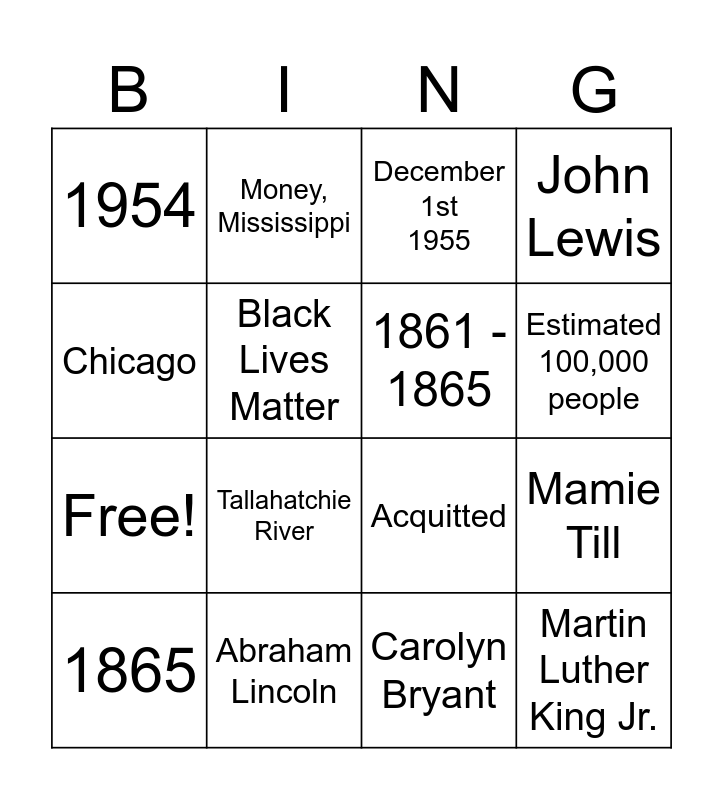 This bingo card has 20 words: Mamie Till, J.W. Milam and Roy Bryant, December 1st 1955, 13th Amendment, 1865, Chicago, Abraham Lincoln, 1954, Free!, Money, Mississippi, Tallahatchie River, Acquitted, Black Lives Matter, Martin Luther King Jr., 1861 - 1865, 1896, Estimated 100,000 people, John Lewis, Carolyn Bryant and Little Rock 9.