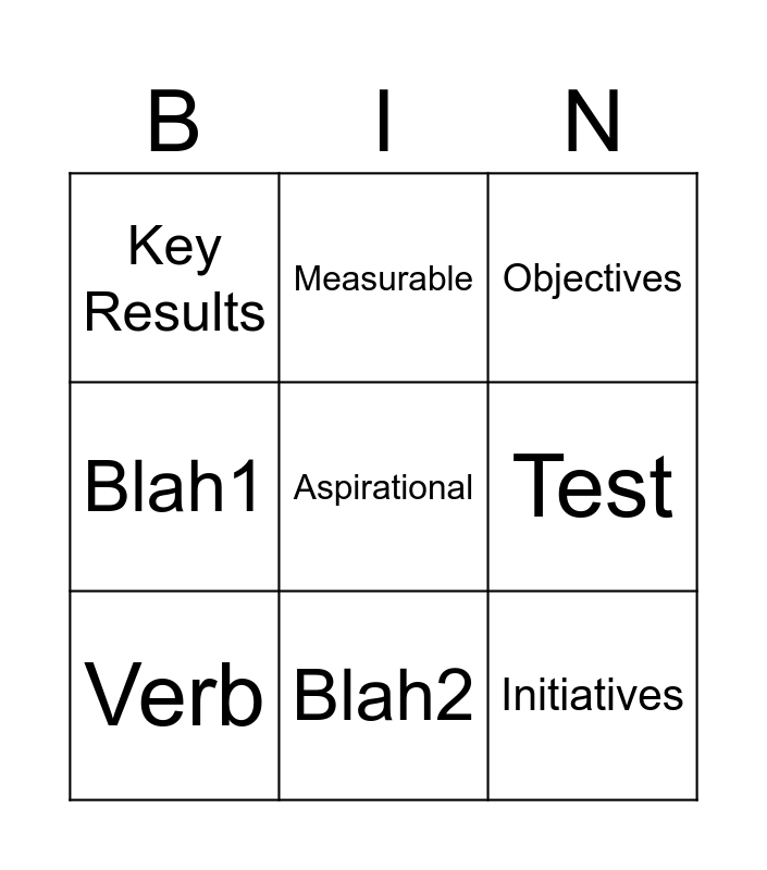 This bingo card has a free space and 8 words: Test, Objectives, Measurable, Verb, Key Results, Initiatives, Blah1 and Blah2.