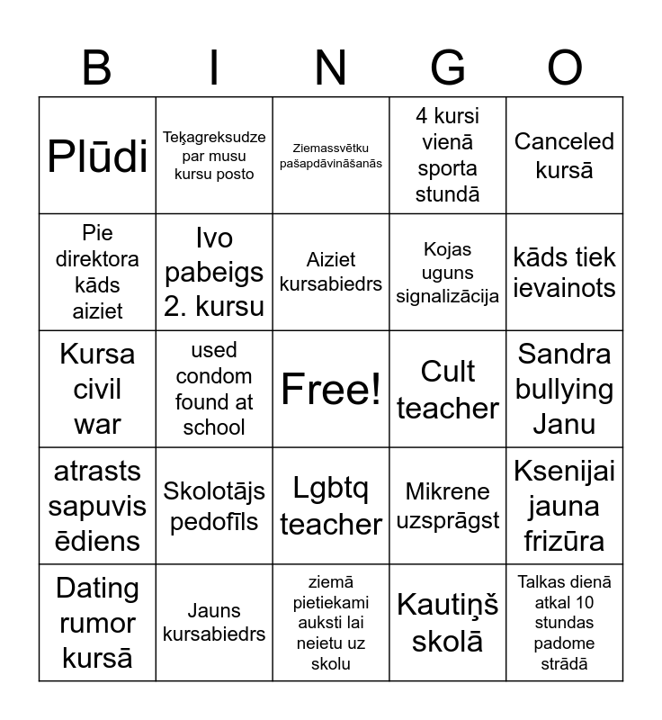 This bingo card has a free space and 24 words: Skolotājs pedofīls, Jauns kursabiedrs, Aiziet kursabiedrs, Dating rumor kursā, Canceled kursā, Plūdi, Pie direktora kāds aiziet, Teķagreksudze par musu kursu posto, Cult teacher, Lgbtq teacher, Kojas uguns signalizācija, Kursa civil war, Mikrene uzsprāgst, Ksenijai jauna frizūra, Ivo pabeigs 2. kursu, Kautiņš skolā, Sandra bullying Janu, Ziemassvētku pašapdāvināšanās, kāds tiek ievainots, used condom found at school, Talkas dienā atkal 10 stundas padome strādā, atrasts sapuvis ēdiens, 4 kursi vienā sporta stundā and ziemā pietiekami auksti lai neietu uz skolu.