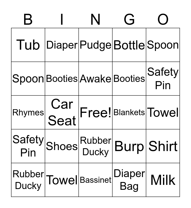 ⚠ This card has duplicate items: Socks (2), Bib (2), Bassinet (2), Pacifier (2), Bottle (2), Cradle (2), Booties (2), Lullaby (2), Rubber Ducky (2), Crib (2), Safety Pin (2), Tub (2), Burp (2), Spoon (2), Baby Food (2), Towel (2), Shoes (2), Milk (2), Shirt (2), Diaper Bag (2)