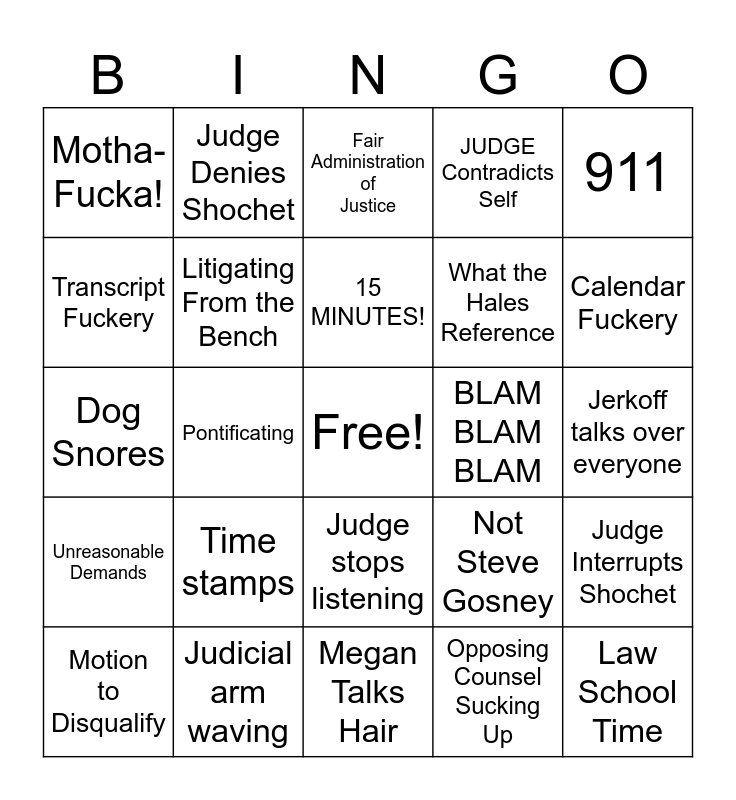 This bingo card has a free space and 24 words: Time stamps, Judicial arm waving, 15 MINUTES!, Motion to Disqualify, 911, Motha- Fucka!, Transcript Fuckery, Judge Denies Shochet, BLAM BLAM BLAM, Judge stops listening, What the Hales Reference, Dog Snores, Not Steve Gosney, Judge Interrupts Shochet, Litigating From the Bench, Opposing Counsel Sucking Up, Jerkoff talks over everyone, Fair Administration of Justice, Calendar Fuckery, Pontificating, Law School Time, Unreasonable Demands, JUDGE Contradicts Self and Megan Talks Hair.
