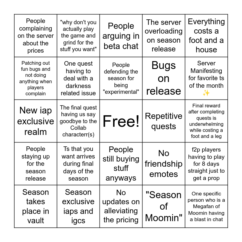 This bingo card has a free space and 24 words: Ts that you want arrives during final days of the season, Season exclusive iaps and igcs, People defending the season for being "experimental", Season takes place in vault, Everything costs a foot and a house, People complaining on the server about the prices, Patching out fun bugs and not doing anything when players complain, "why don't you actually play the game and grind for the stuff you want", Repetitive quests, People still buying stuff anyways, Bugs on release, New iap exclusive realm, No friendship emotes, f2p players having to play for 8 days straight just to get a prop, One quest having to deal with a darkness related issue, "Season of Moomin", Final reward after completing quests is underwhelming while costing a foot and a leg, People arguing in beta chat, Server Manifesting for favorite ts of the month ✨, The final quest having us say goodbye to the Collab characterr(s), One specific person who is a Megafan of Moomin having a blast in chat, People staying up for the season release, The server overloading on season release and No updates on alleviating the pricing.