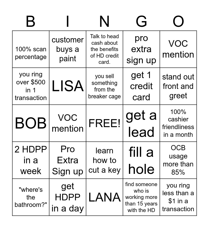 This bingo card has a free space and 24 words: Pro Extra Sign up, get HDPP in a day, you sell something from the breaker cage, "where's the bathroom?", VOC mention, 100% scan percentage, you ring over $500 in 1 transaction, customer buys a paint, get a lead, learn how to cut a key, get 1 credit card, BOB, fill a hole, OCB usage more than 85%, LISA, find someone who is working more than 15 years with the HD, 100% cashier friendliness in a month, Talk to head cash about the benefits of HD credit card., stand out front and greet, VOC mention, you ring less than a $1 in a transaction, 2 HDPP in a week, pro extra sign up and LANA.