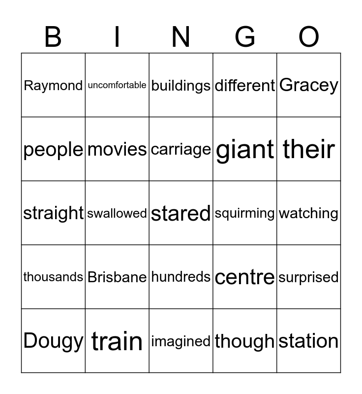 This bingo card has a free space and 24 words: Brisbane, train, carriage, Dougy, Gracey, Raymond, people, uncomfortable, squirming, hundreds, giant, straight, centre, surprised, movies, though, watching, buildings, their, swallowed, station, thousands, different and imagined.