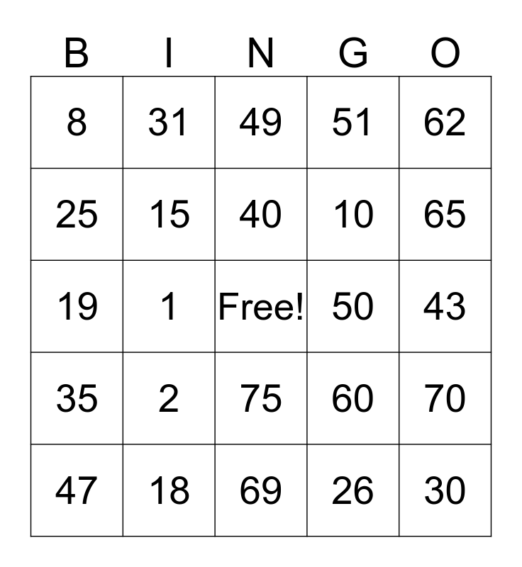 This bingo card has a free space and 24 words: 2, 18, 40, 47, 62, 8, 25, 31, 50, 75, 10, 19, 60, 70, 15, 26, 43, 49, 65, 1, 30, 35, 51 and 69.