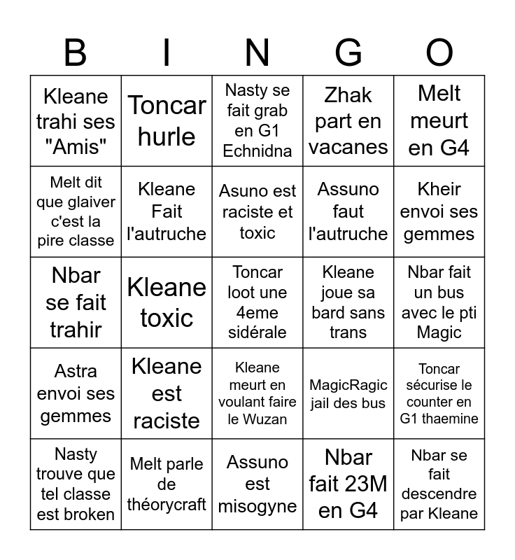 This bingo card has a free space and 24 words: Kleane est raciste, Melt parle de théorycraft, Asuno est raciste et toxic, Nasty trouve que tel classe est broken, Melt meurt en G4, Kleane trahi ses "Amis", Melt dit que glaiver c'est la pire classe, Toncar hurle, Kleane joue sa bard sans trans, Kleane meurt en voulant faire le Wuzan, Assuno faut l'autruche, Nbar se fait trahir, MagicRagic jail des bus, Toncar sécurise le counter en G1 thaemine, Kleane Fait l'autruche, Nbar fait 23M en G4, Nbar fait un bus avec le pti Magic, Nasty se fait grab en G1 Echnidna, Kheir envoi ses gemmes, Kleane toxic, Nbar se fait descendre par Kleane, Astra envoi ses gemmes, Zhak part en vacanes and Assuno est misogyne.