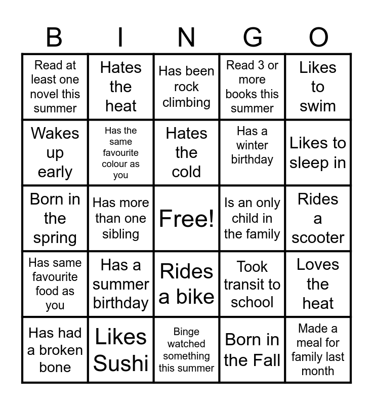 This bingo card has a free space and 29 words: Has had a broken bone, Has been to more than 2 countries, Has more than one sibling, Got a drive to school, Read at least one novel this summer, Has been rock climbing, Has the same favourite colour as you, Has a summer birthday, Is an only child in the family, Likes Sushi, Rides a scooter, Made a meal for family last month, Binge watched something this summer, Born in the Fall, Likes to sleep in, Walks to school, Rides a bike, Has same favourite food as you, Likes to swim, Born in the spring, Took transit to school, Likes ice cream, Has a winter birthday, Wakes up early, Read 3 or more books this summer, Hates the heat, Loves the heat, Hates the cold and Loves the cold.