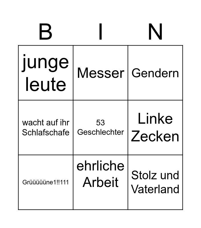 This bingo card has a free space and 8 words: Linke Zecken, Gendern, Messer, Grüüüüüne1!!111, junge leute, Stolz und Vaterland, wacht auf ihr Schlafschafe and ehrliche Arbeit.