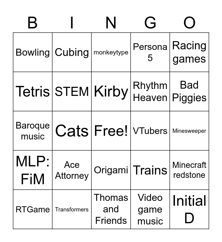 This bingo card has a free space and 24 words: Ace Attorney, Transformers, Kirby, RTGame, Racing games, Bowling, Tetris, Cubing, VTubers, Origami, Rhythm Heaven, Baroque music, Trains, Minecraft redstone, STEM, Video game music, Minesweeper, monkeytype, Bad Piggies, Cats, Initial D, MLP: FiM, Persona 5 and Thomas and Friends.