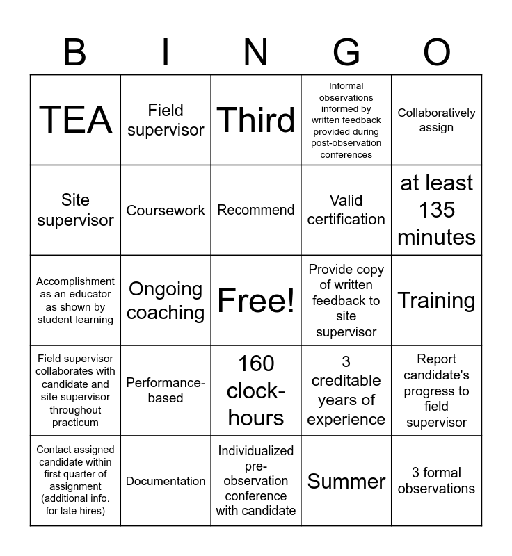 This bingo card has a free space and 26 words: 160 clock-hours, Summer, Recommend, Documentation, Collaboratively assign, TEA, Site supervisor, Field supervisor, Training, 3 creditable years of experience, Valid certification, Accomplishment as an educator as shown by student learning, Report candidate's progress to field supervisor, Contact assigned candidate within first quarter of assignment (additional info. for late hires), Ongoing coaching, At least 3 informal observations that are 15 minutes or more per semester of practicum assignment, Informal observations informed by written feedback provided during post-observation conferences, Field supervisor collaborates with candidate and site supervisor throughout practicum, Third, 3 formal observations, at least 135 minutes, Individualized pre-observation conference with candidate, Provide copy of written feedback to site supervisor, Performance-based, Coursework and Quality of Online Coursework.