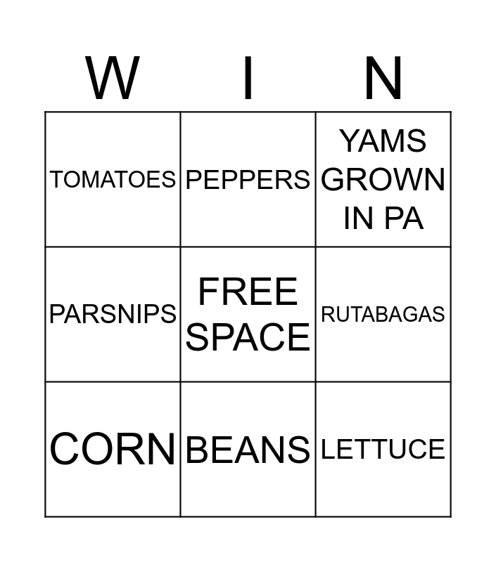 This bingo card has a free space and 8 words: RUTABAGAS, YAMS GROWN IN PA, PEPPERS, CORN, TOMATOES, LETTUCE, PARSNIPS and BEANS.