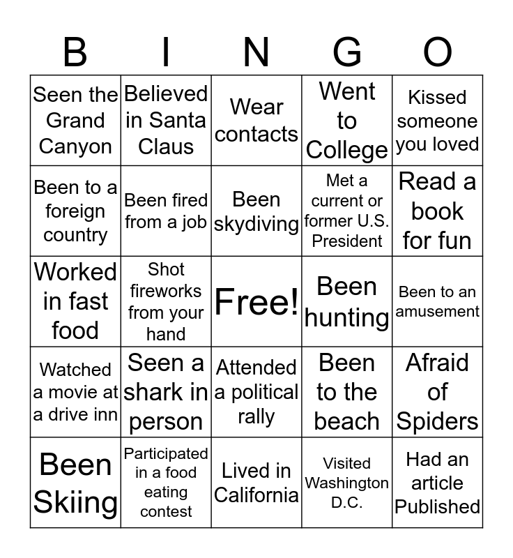 This bingo card has a free space and 24 words: Seen a shark in person, Participated in a food eating contest, Been skydiving, Been Skiing, Kissed someone you loved, Seen the Grand Canyon, Been to a foreign country, Believed in Santa Claus, Been hunting, Attended a political rally, Met a current or former U.S. President, Worked in fast food, Been to the beach, Afraid of Spiders, Been fired from a job, Visited Washington D.C., Been to an amusement, Wear contacts, Read a book for fun, Shot fireworks from your hand, Had an article Published, Watched a movie at a drive inn, Went to College and Lived in California.