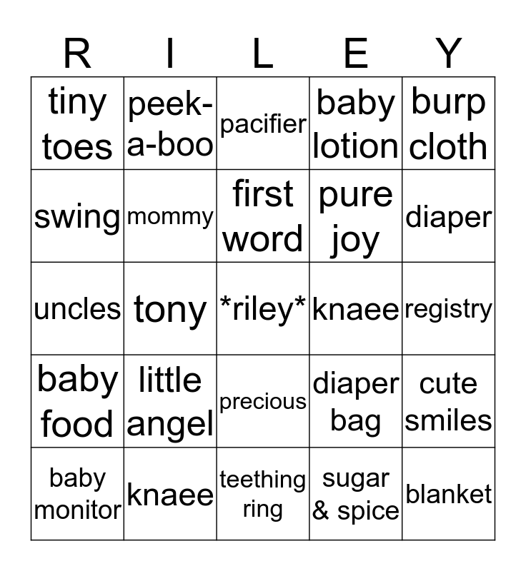 This bingo card has a free space and 49 words: breast milk, blanket, uncles, teething ring, little angel, aunties, peek-a-boo, high chair, swing, family, mommy, baby lotion, cute smiles, diaper bag, onesie, toys, first word, knaee, stork, burp cloth, tony, sugar & spice, tiny toes, pure joy, joy, diaper, baby monitor, sippy cup, precious, baby food, sweet, nursery rhyme, stroller, diaper pins, knaee, formula, rubber ducky, bib, registry, lullaby, tony, grandma, aunties, daddy, uncles, pacifier, mobile, booties and grandpa.