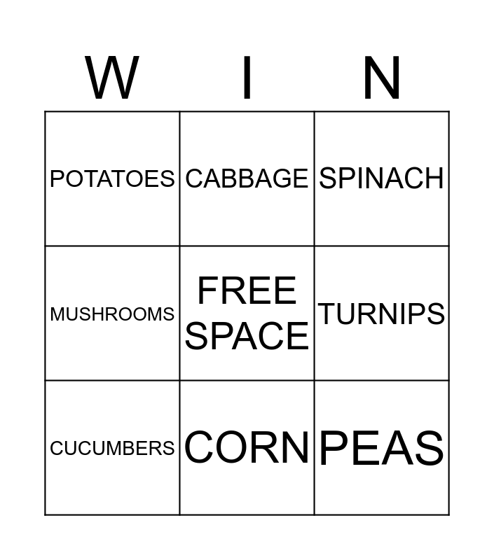 This bingo card has a free space and 8 words: TURNIPS, SPINACH, CABBAGE, CUCUMBERS, POTATOES, PEAS, MUSHROOMS and CORN.