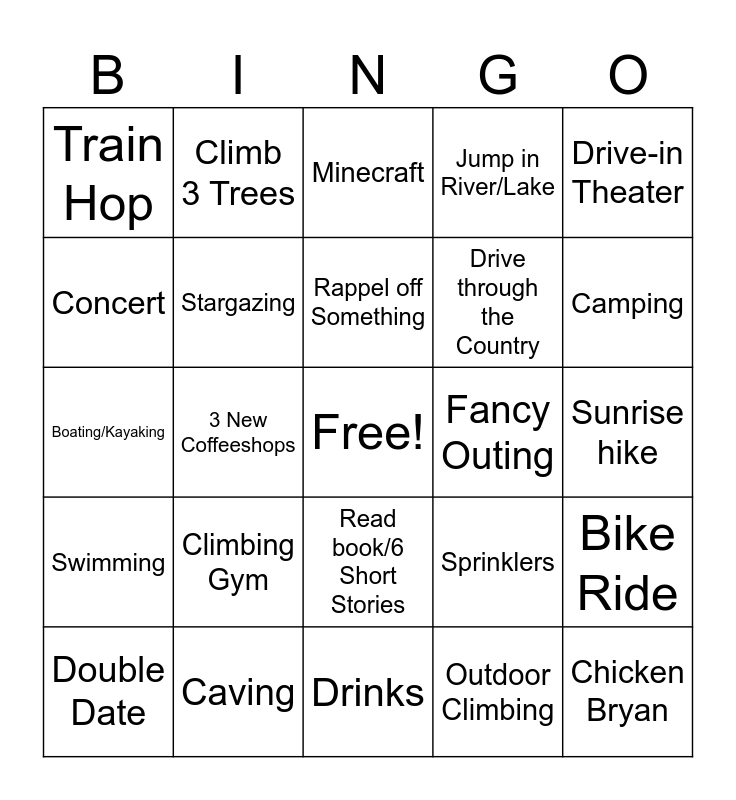 This bingo card has a free space and 24 words: Climbing Gym, Caving, Rappel off Something, Double Date, Drive-in Theater, Train Hop, Concert, Climb 3 Trees, Fancy Outing, Read book/6 Short Stories, Drive through the Country, Boating/Kayaking, Sprinklers, Bike Ride, Stargazing, Outdoor Climbing, Sunrise hike, Minecraft, Camping, 3 New Coffeeshops, Chicken Bryan, Swimming, Jump in River/Lake and Drinks.