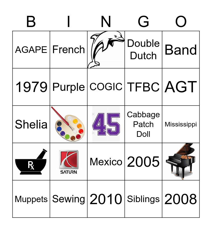 This bingo card has 5 images, a free space and 19 words: Sewing, COGIC, Muppets, Band, AGAPE, 1979, French, Cabbage Patch Doll, Mexico, TFBC, Shelia, 2005, Purple, Siblings, Mississippi, AGT, 2008, Double Dutch and 2010.