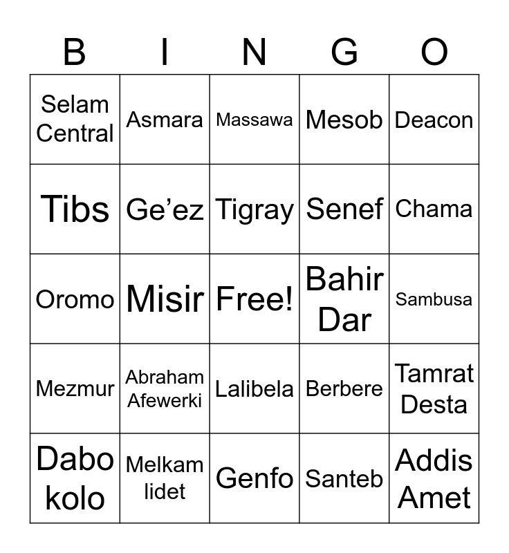 This bingo card has a free space and 64 words: Netela, Teddy Afro, Aster Aweke, Tamrat Desta, Addis Ababa, Eritrea, Asmara, Gonder, Tigray, Kemis, Lalibela, Kebero, Sambusa, Deacon, Kitfo, Tibs, Misir, Selam Central, Keren, Senef, Abraham Afewerki, Mezmur, Mesob, Kunama, Jebena, Doro Wot, Injera, Tej, Abebayehosh, Buna Enteta, Gursha, Selam, Buna, Ethiopia, Chama, Dabo kolo, Meskel, Santeb, A+++, Ge’ez, Oromo, Bahir Dar, Ethiopian Day, Eritrean Independence Day, Timket, Addis Amet, Melkam lidet, Injera, Berbere, Alicha, Metmeta, Misir wot, Genfo, Harrar, Wolayta, Gurage, Massawa, HSA, Rashida, Belen, The Weekend, Rubi Rose, Nipsey and Liya.