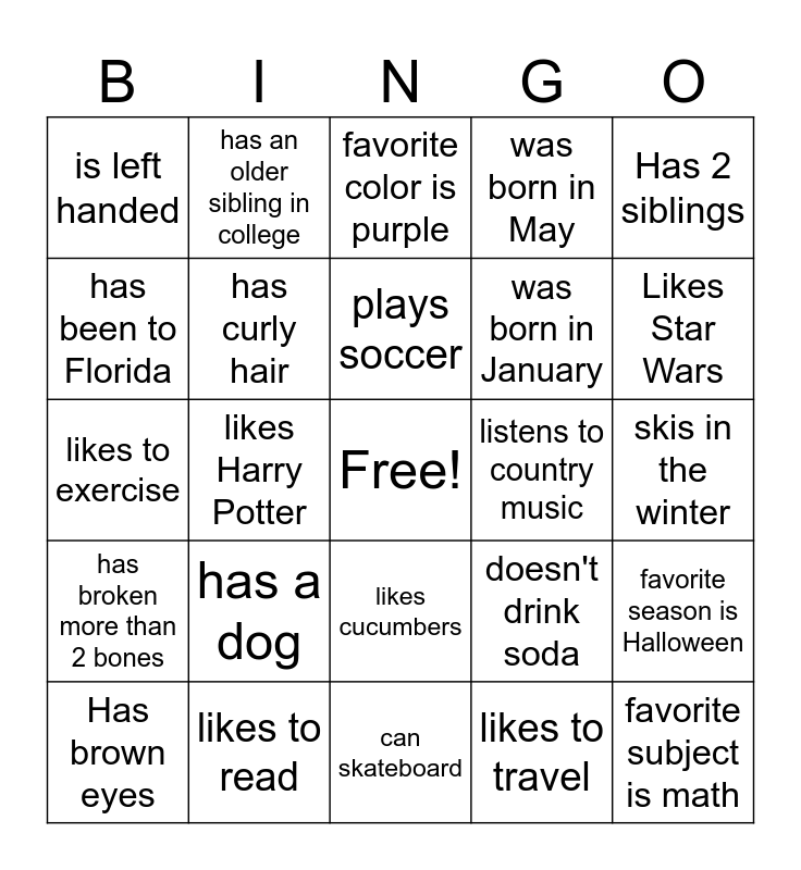 This bingo card has a free space and 24 words: has a dog, likes to read, plays soccer, Has brown eyes, Has 2 siblings, is left handed, has been to Florida, has an older sibling in college, listens to country music, likes cucumbers, was born in January, likes to exercise, doesn't drink soda, favorite season is Halloween, has curly hair, likes to travel, skis in the winter, favorite color is purple, Likes Star Wars, likes Harry Potter, favorite subject is math, has broken more than 2 bones, was born in May and can skateboard.