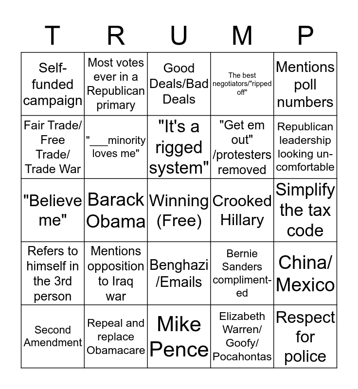 This bingo card has a free space and 24 words: Mentions opposition to Iraq war, Repeal and replace Obamacare, "It's a rigged system", Second Amendment, Mentions poll numbers, Self-funded campaign, Fair Trade/ Free Trade/ Trade War, Most votes ever in a Republican primary, Crooked Hillary, Benghazi /Emails, "Get em out" /protesters removed, "Believe me", Bernie Sanders compliment-ed, China/ Mexico, "___minority loves me", Elizabeth Warren/ Goofy/ Pocahontas, Simplify the tax code, Good Deals/Bad Deals, Republican leadership looking un-comfortable, Barack Obama, Respect for police, Refers to himself in the 3rd person, The best negotiators/"ripped off" and Mike Pence.