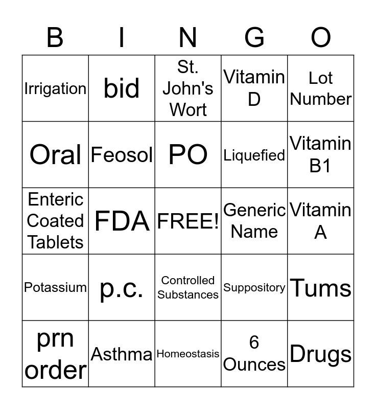This bingo card has a free space and 24 words: p.c., Asthma, PO, prn order, Lot Number, Irrigation, Oral, bid, Generic Name, Controlled Substances, Liquefied, Enteric Coated Tablets, Suppository, Tums, Feosol, 6 Ounces, Vitamin A, St. John's Wort, Vitamin B1, FDA, Drugs, Potassium, Vitamin D and Homeostasis.