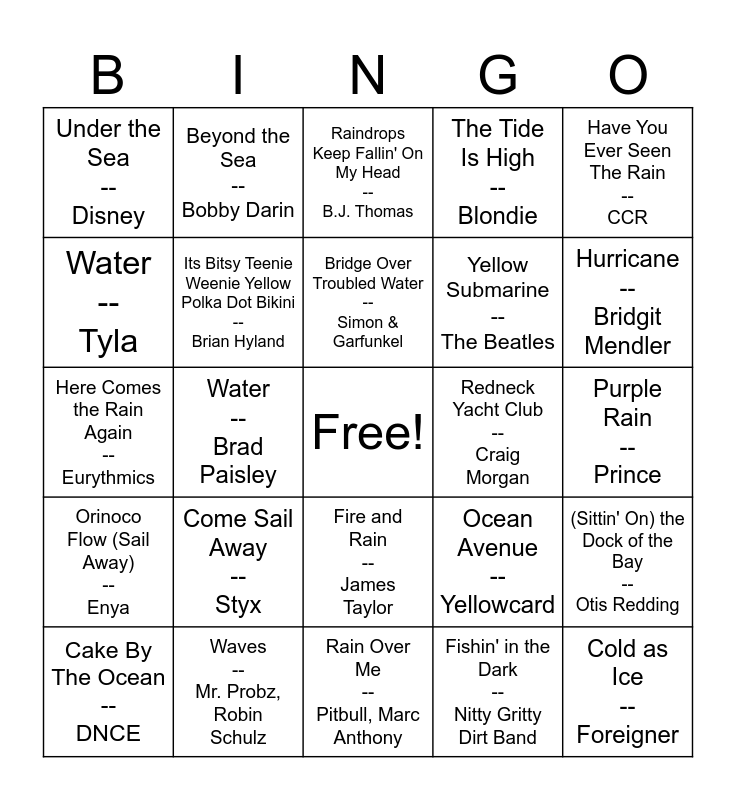This bingo card has a free space and 64 words: Surfin' USA -- Beach Boys, Waterfalls -- TLC, Surf City -- Jan & Dean, (Sittin' On) the Dock of the Bay -- Otis Redding, Island In The Sun -- Weezer, Under the Boardwalk -- The Drifters, Beyond the Sea -- Bobby Darin, Beachin' -- Jake Owen, Bridge Over Troubled Water -- Simon & Garfunkel, November Rain -- Guns 'N' Roses, Fire and Rain -- James Taylor, Black Water -- The Doobie Brothers, Purple Rain -- Prince, Have You Ever Seen The Rain -- CCR, Smoke on the Water -- Deep Purple, Water -- Tyla, Water -- Brad Paisley, Under the Sea -- Disney, Octopus's Garden -- The Beatles, Yellow Submarine -- The Beatles, Come Sail Away -- Styx, Orinoco Flow (Sail Away) -- Enya, The Tide Is High -- Blondie, Knee Deep -- Zac Brown Band, Jimmy Buffett, Astronaut In The Ocean -- Masked Wolf, Cold Water -- Major Lazer, Justin Bieber, Cry Me a River -- Justin Timberlake, Umbrella -- Rihanna, Jay-Z, It Will Rain -- Bruno Mars, Set Fire to the Rain -- Adele, Swimming Pools -- Kendrick Lamar, Drowning -- A Boogie Wit da Hoodie, Kodak Black, It's Raining Men -- The Weather Girls, Hurricane -- Luke Combs, Hurricane -- Bridgit Mendler, Cake By The Ocean -- DNCE, Chattahoochee -- Alan Jackson, Fishin' in the Dark -- Nitty Gritty Dirt Band, Message In A Bottle -- The Police, Its Bitsy Teenie Weenie Yellow Polka Dot Bikini -- Brian Hyland, Here Comes the Rain Again -- Eurythmics, Redneck Yacht Club -- Craig Morgan, Whiskey River -- Willie Nelson, ocean eyes -- Billie Eilish, Ice Ice Baby -- Vanilla Ice, Cold as Ice -- Foreigner, Waves -- Mr. Probz, Robin Schulz, In Too Deep -- Sum 41, Ocean Avenue -- Yellowcard, When It Rains It Pours, Rain Is A Good Thing -- Luke Bryan, Rainbow Connection -- Weezer, Hayley Williams, Rain Over Me -- Pitbull, Marc Anthony, Rain -- Creed, Rain On Me -- Lady Gaga, Ariana Grande, Rainbow -- Cage The Elephant, Raindrops Keep Fallin' On My Head -- B.J. Thomas, Rock You Like A Hurricane -- Scorpions, I Can't Stand the Rain -- Tina Turner, I Wish It Would Rain -- The Temptations, Rainy Days And Mondays -- Carpenters, She's A Rainbow -- The Rolling Stones, No Rain -- Blind Melon and Fool in the Rain -- Led Zeppelin.