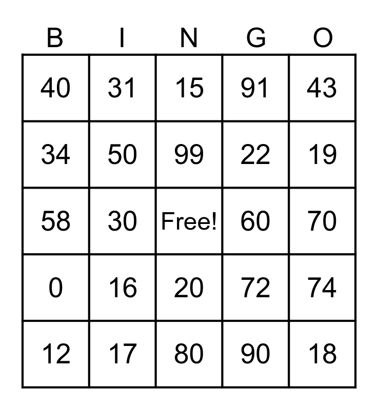 This bingo card has a free space and 29 words: 12, 13, 30, 14, 40, 15, 50, 16, 60, 17, 70, 18, 80, 90, 19, 11, 20, 0, 43, 58, 72, 67, 22, 34, 91, 31, 74, 99 and 100.
