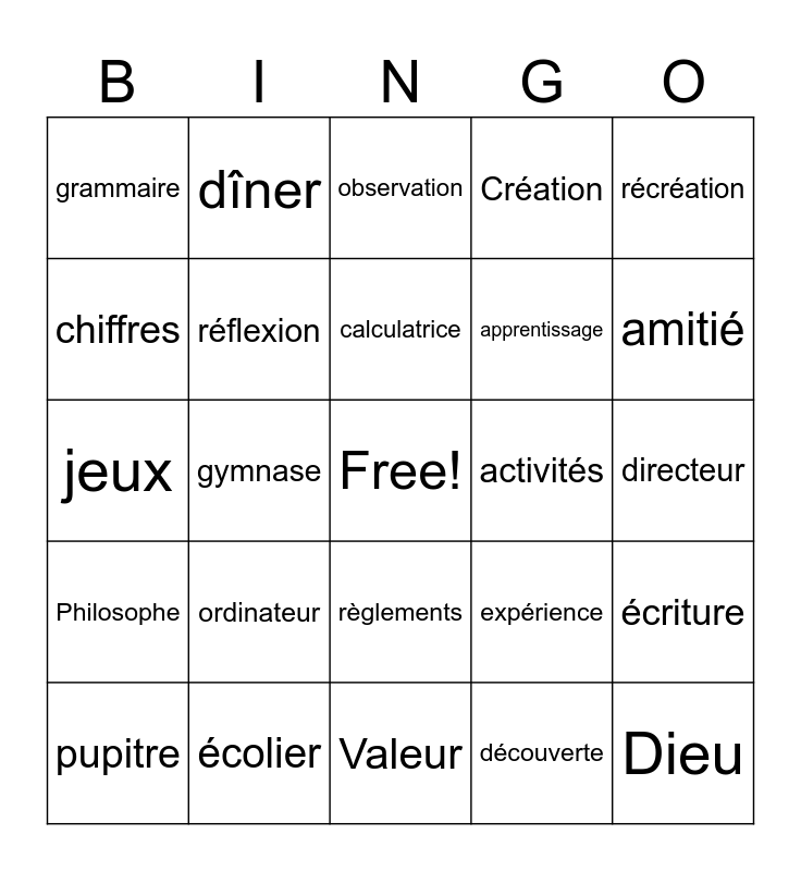 This bingo card has a free space and 24 words: ordinateur, écolier, calculatrice, pupitre, récréation, grammaire, chiffres, dîner, activités, règlements, apprentissage, jeux, expérience, écriture, réflexion, découverte, directeur, observation, amitié, gymnase, Dieu, Philosophe, Création and Valeur.