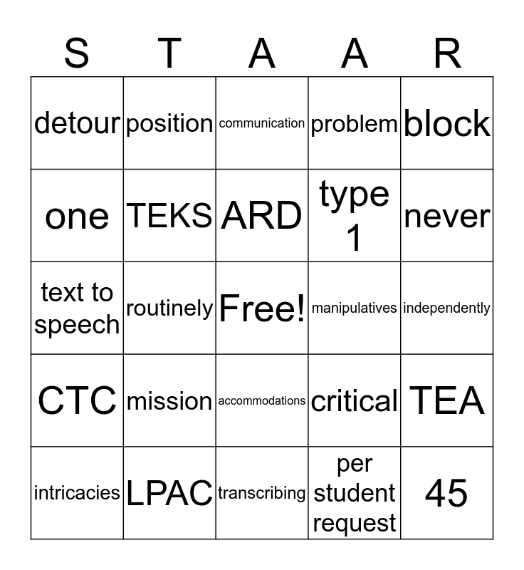 This bingo card has a free space and 24 words: mission, LPAC, ARD, intricacies, block, detour, one, position, manipulatives, accommodations, type 1, text to speech, critical, TEA, TEKS, per student request, independently, communication, never, routinely, 45, CTC, problem and transcribing.