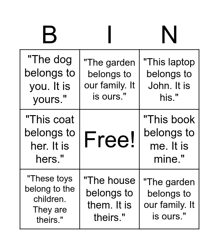 This bingo card has a free space and 8 words: "This book belongs to me. It is mine.", "This laptop belongs to John. It is his.", "The garden belongs to our family. It is ours.", "These toys belong to the children. They are theirs.", "The dog belongs to you. It is yours.", "The garden belongs to our family. It is ours.", "This coat belongs to her. It is hers." and "The house belongs to them. It is theirs.".