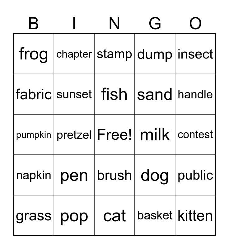 This bingo card has a free space and 34 words: rabbit, basket, thunder, bed, napkin, sunset, insect, grass, chapter, picnic, fish, stamp, cliff, pencil, milk, handle, pop, pumpkin, pen, dog, brush, carpet, frog, contest, cat, kitten, dump, trumpet, sand, fabric, mascot, pretzel, public and goblin.