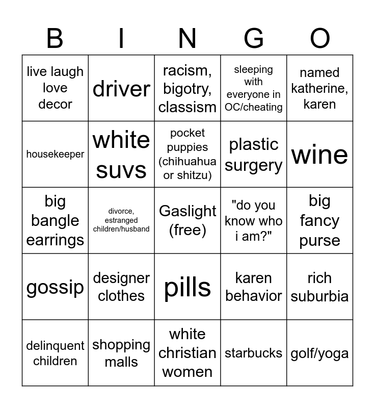 This bingo card has a free space and 24 words: designer clothes, shopping malls, pocket puppies (chihuahua or shitzu), delinquent children, named katherine, karen, live laugh love decor, housekeeper, driver, "do you know who i am?", pills, plastic surgery, big bangle earrings, karen behavior, rich suburbia, white suvs, starbucks, big fancy purse, racism, bigotry, classism, wine, divorce, estranged children/husband, golf/yoga, gossip, sleeping with everyone in OC/cheating and white christian women.