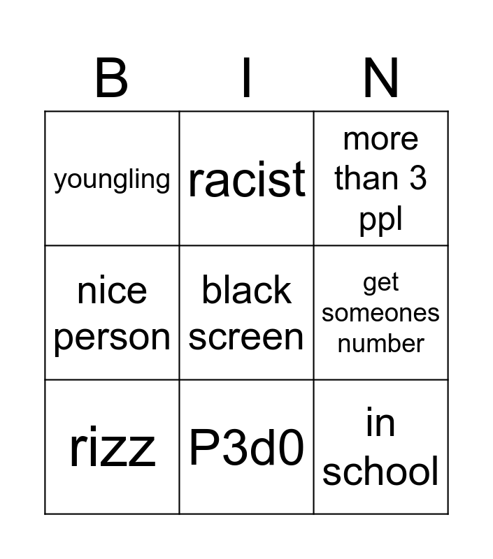 This bingo card has a free space and 8 words: get someones number, more than 3 ppl, racist, rizz, youngling, in school, nice person and P3d0.