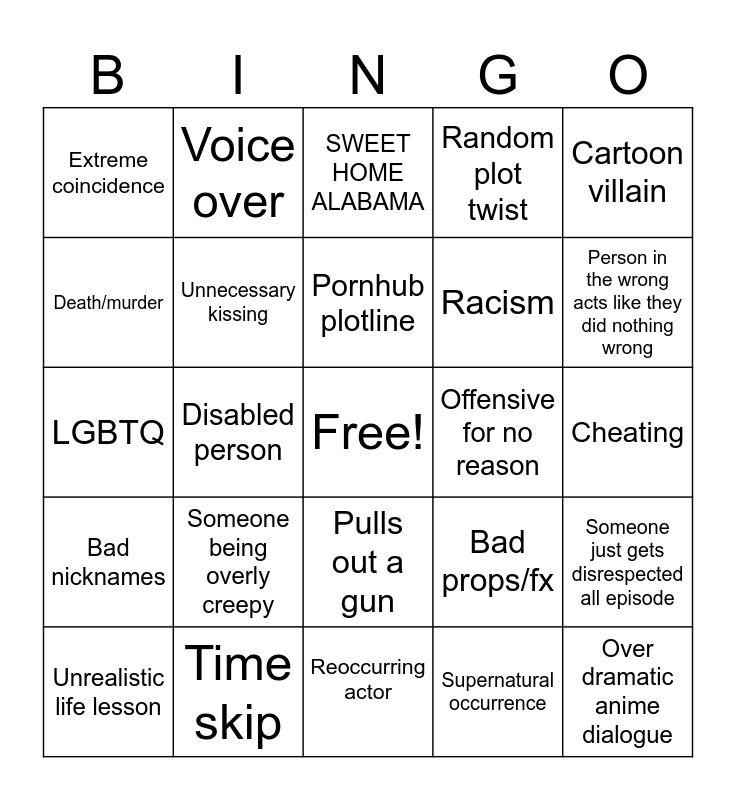 This bingo card has a free space and 24 words: Someone being overly creepy, Time skip, Pornhub plotline, Unrealistic life lesson, Cartoon villain, Extreme coincidence, Death/murder, Voice over, Offensive for no reason, Pulls out a gun, Racism, LGBTQ, Bad props/fx, Someone just gets disrespected all episode, Unnecessary kissing, Supernatural occurrence, Cheating, SWEET HOME ALABAMA, Person in the wrong acts like they did nothing wrong, Disabled person, Over dramatic anime dialogue, Bad nicknames, Random plot twist and Reoccurring actor.