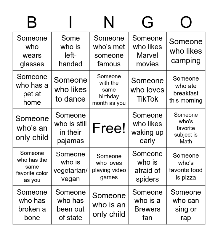 This bingo card has a free space and 24 words: Someone who is vegetarian/ vegan, Someone who has been out of state, Someone with the same birthday month as you, Someone who has broken a bone, Someone who likes camping, Someone who wears glasses, Someone who has a pet at home, Some who is left-handed, Someone who likes waking up early, Someone who loves playing video games, Someone who loves TikTok, Someone who's an only child, Someone who is afraid of spiders, Someone who's favorite food is pizza, Someone who likes to dance, Someone who is a Brewers fan, Someone who's favorite subject is Math, Someone who's met someone famous, Someone who ate breakfast this morning, Someone who is still in their pajamas, Someone who can sing or rap, Someone who has the same favorite color as you, Someone who likes Marvel movies and Someone who is an only child.