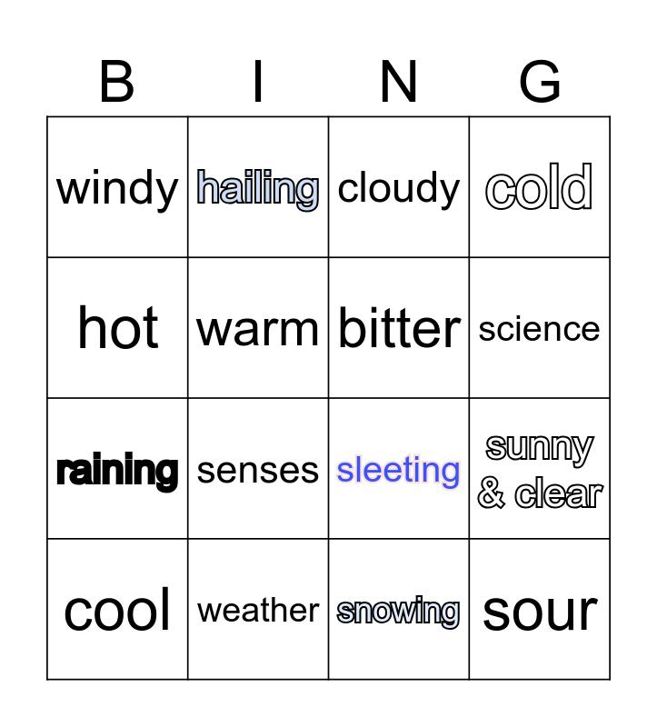 This bingo card has 16 words: weather, sunny & clear, cloudy, windy, raining, hailing, sleeting, snowing, hot, warm, cool, cold, senses, science, bitter and sour.