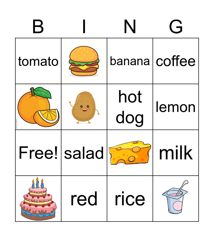 This bingo card has 8 images and 12 words: milk, banana, pizza, red, tomato, Free!, salad, hot dog, kiwi, lemon, coffee and rice.