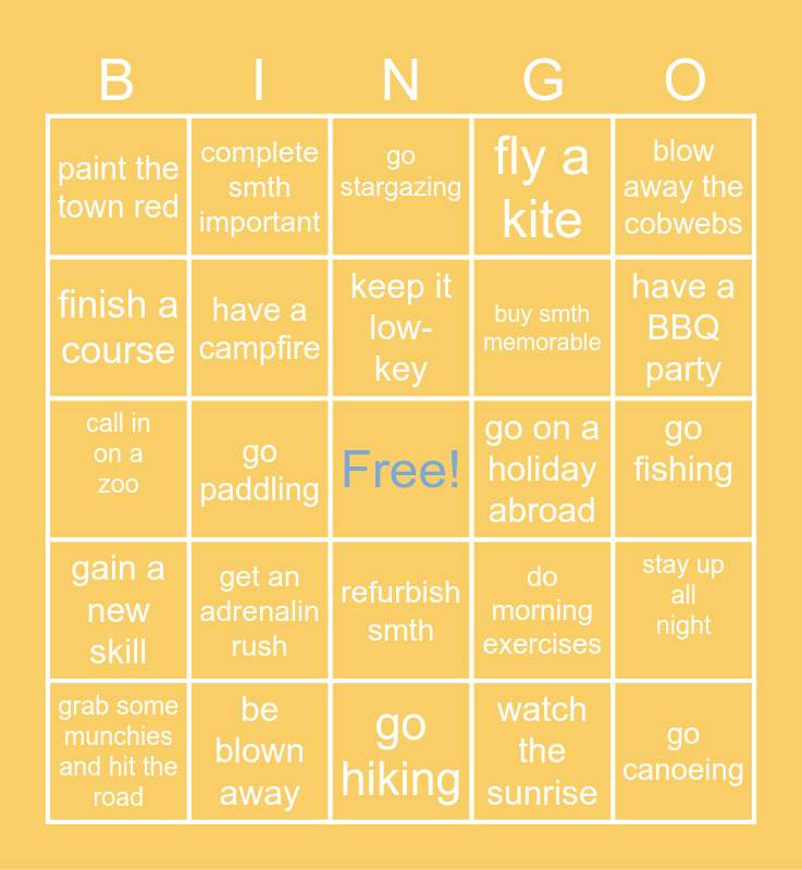 This bingo card has a free space and 24 words: get an adrenalin rush, be blown away, keep it low-key, grab some munchies and hit the road, blow away the cobwebs, paint the town red, finish a course, complete smth important, go on a holiday abroad, refurbish smth, buy smth memorable, call in on a zoo, do morning exercises, stay up all night, have a campfire, watch the sunrise, go fishing, go stargazing, have a BBQ party, go paddling, go canoeing, gain a new skill, fly a kite and go hiking.