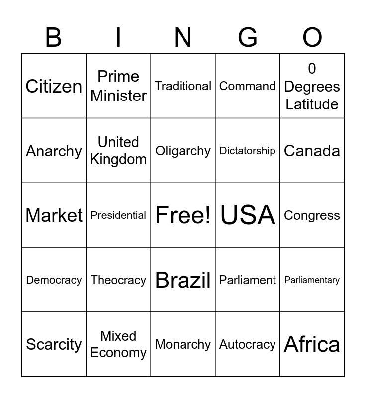 This bingo card has a free space and 24 words: Theocracy, Mixed Economy, Oligarchy, Scarcity, 0 Degrees Latitude, Citizen, Anarchy, Prime Minister, USA, Brazil, Dictatorship, Market, Parliament, Parliamentary, United Kingdom, Autocracy, Congress, Traditional, Canada, Presidential, Africa, Democracy, Command and Monarchy.