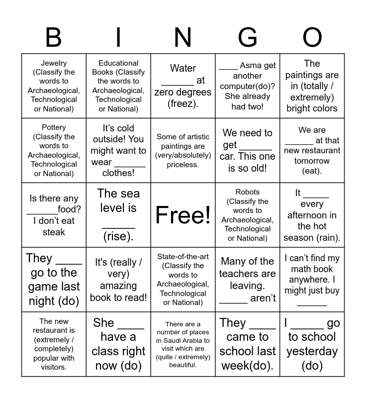 This bingo card has a free space and 25 words: It's (really / very) amazing book to read!, There are a number of places in Saudi Arabia to visit which are (quite / extremely) beautiful., Some of artistic paintings are (very/absolutely) priceless., The new restaurant is (extremely / completely) popular with visitors., The paintings are in (totally / extremely) bright colors, Jewelry (Classify the words to Archaeological, Technological or National), Pottery (Classify the words to Archaeological, Technological or National), Educational Books (Classify the words to Archaeological, Technological or National), Robots (Classify the words to Archaeological, Technological or National), State-of-the-art (Classify the words to Archaeological, Technological or National), We need to get ______ car. This one is so old!, Is there any ______food? I don’t eat steak, Many of the teachers are leaving. _____ aren’t, I can’t find my math book anywhere. I might just buy ______, It’s cold outside! You might want to wear ______ clothes!, He _____ tea at breakfast (drink)., It _____ every afternoon in the hot season (rain)., Water ______ at zero degrees (freez)., We are ______ at that new restaurant tomorrow (eat)., The sea level is _____ (rise)., I _____ go to school yesterday (do), She ____ have a class right now (do), They ____ go to the game last night (do), ____ Asma get another computer(do)? She already had two! and They ____ came to school last week(do)..