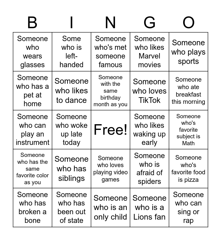 This bingo card has a free space and 24 words: Someone who has siblings, Someone who has been out of state, Someone with the same birthday month as you, Someone who has broken a bone, Someone who plays sports, Someone who wears glasses, Someone who has a pet at home, Some who is left-handed, Someone who likes waking up early, Someone who loves playing video games, Someone who loves TikTok, Someone who can play an instrument, Someone who is afraid of spiders, Someone who's favorite food is pizza, Someone who likes to dance, Someone who is a Lions fan, Someone who's favorite subject is Math, Someone who's met someone famous, Someone who ate breakfast this morning, Someone who woke up late today, Someone who can sing or rap, Someone who has the same favorite color as you, Someone who likes Marvel movies and Someone who is an only child.