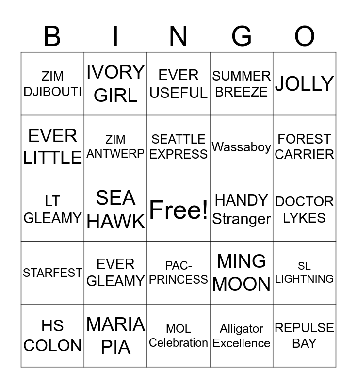 This bingo card has a free space and 24 words: EVER GLEAMY, MARIA PIA, SEATTLE EXPRESS, HS COLON, JOLLY, ZIM DJIBOUTI, EVER LITTLE, IVORY GIRL, HANDY Stranger, PAC-PRINCESS, Wassaboy, LT GLEAMY, MING MOON, SL LIGHTNING, ZIM ANTWERP, Alligator Excellence, DOCTOR LYKES, EVER USEFUL, FOREST CARRIER, SEA HAWK, REPULSE BAY, STARFEST, SUMMER BREEZE and MOL Celebration.