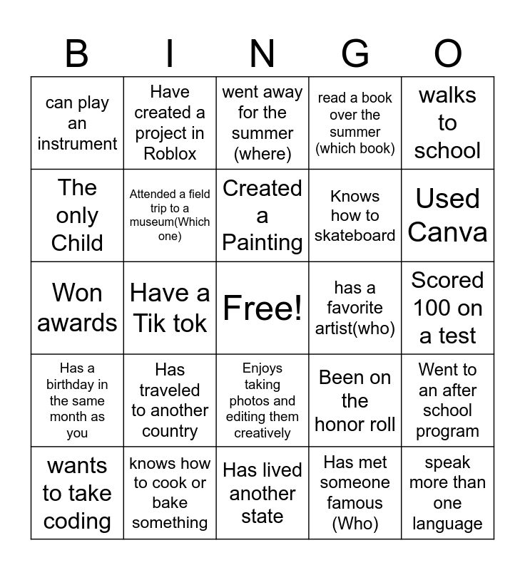 This bingo card has a free space and 25 words: Has traveled to another country, Has lived another state, Created a Painting, wants to take coding, walks to school, can play an instrument, The only Child, Have created a project in Roblox, has a favorite artist(who), Enjoys taking photos and editing them creatively, Knows how to skateboard, Won awards, Been on the honor roll, Went to an after school program, Attended a field trip to a museum(Which one), Attended a School assembly, Scored 100 on a test, went away for the summer (where), Used Canva, Have a Tik tok, speak more than one language, knows how to cook or bake something, Has a birthday in the same month as you, read a book over the summer (which book) and Has met someone famous (Who).