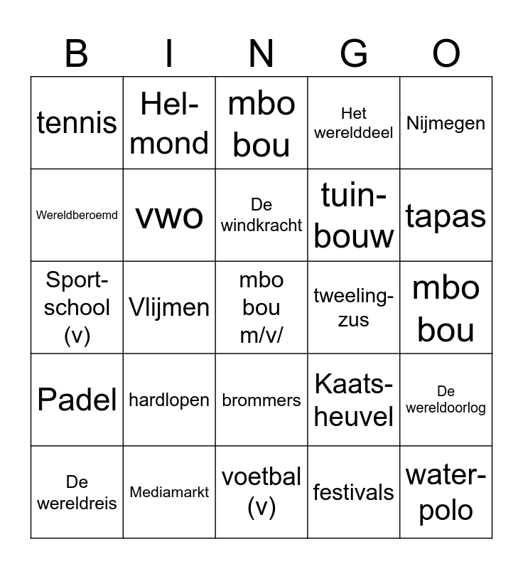 This bingo card has a free space and 30 words: Mediamarkt, hockey, Vlijmen, built environ-ment, tennis, mbo bou, vwo, brommers, tweeling-zus, voetbal (v), mbo bou, water-polo, festivals, 17 jaar, tapas, tussenjaar, Kaats-heuvel, Padel, hardlopen, Nijmegen, Sport-school (v), Houten, Hel-mond, tuin-bouw, Wereldberoemd, Het werelddeel, De wereldoorlog, De wereldreis, De windkracht and De windmolen.